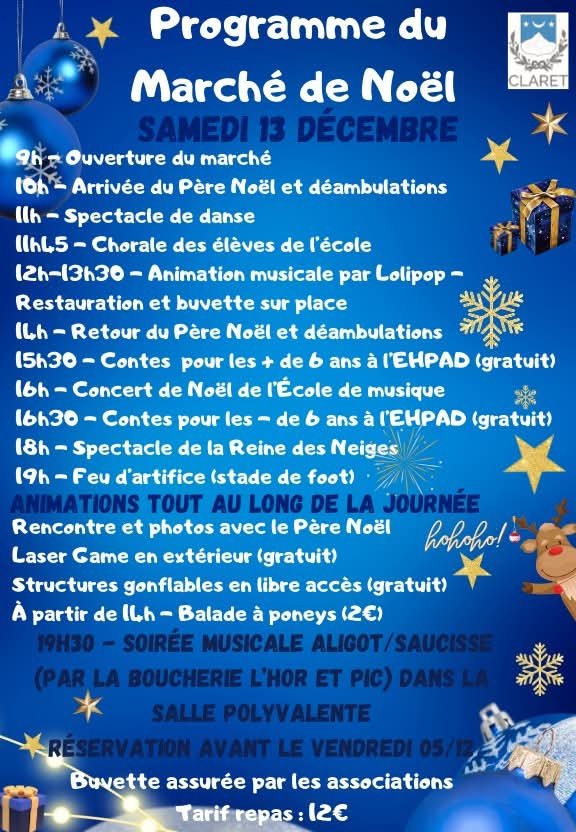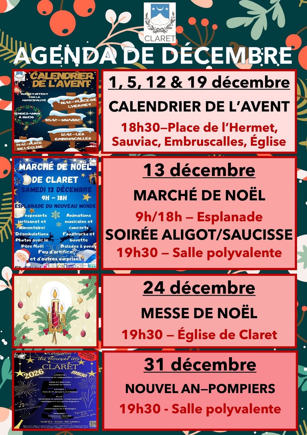 La commune a relancĂ© cette annĂ©e son calendrier de l'avent avec 4 dates organisĂ©es par la municipalitĂ© avec buffet offert : le 5 dĂ©cembre RDV Ă Sauviac, le 12 dĂ©cembre RDV aux Embruscalles et le 19 dĂ©cembre RDV sur la Place de l'Ă©glise. Mais ce n'est pas tout quelques clarĂ©tains se sont portĂ©s volontaires pour accueillir leurs voisins chez eux !Â