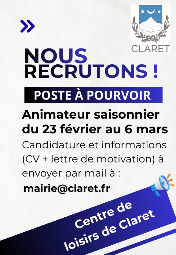 Modalités de candidature : Les dossiers (CV et lettre de motivation) sont à déposer avant le 26 janvier 2026, soit directement en mairie, soit par courriel à l’adresse suivante : mairie@claret.fr.