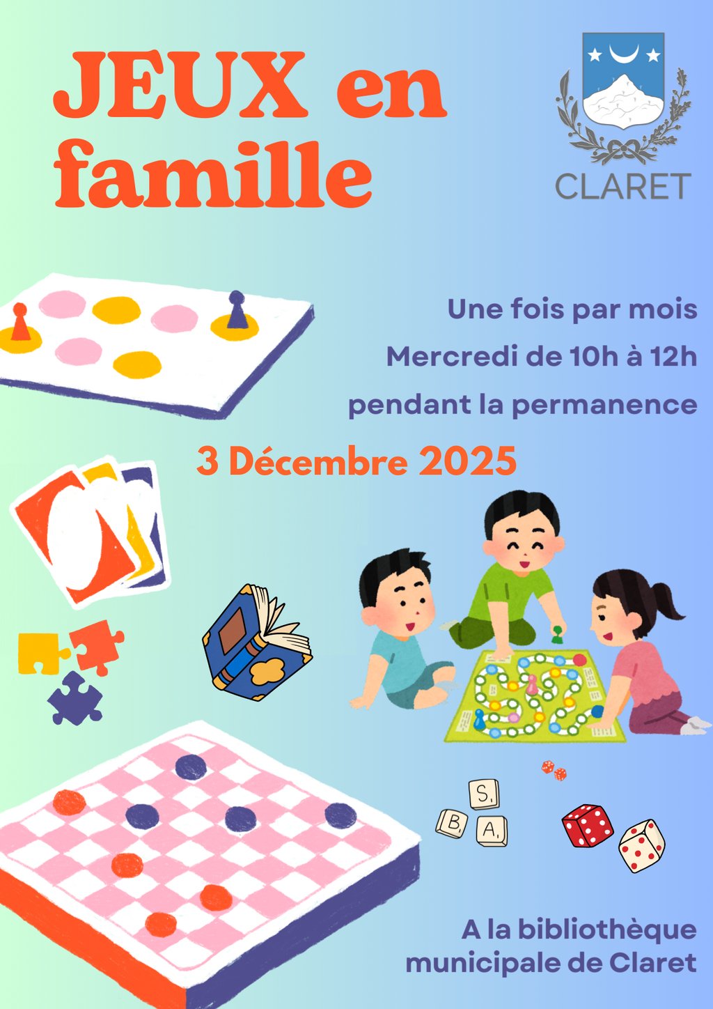 À vos agendas, les bénévoles de la bibliothèque vous donner rendez-vous le mercredi 3 décembre puis le mercredi 7 janvier 2026 pour une matinée jeux de société en famille !