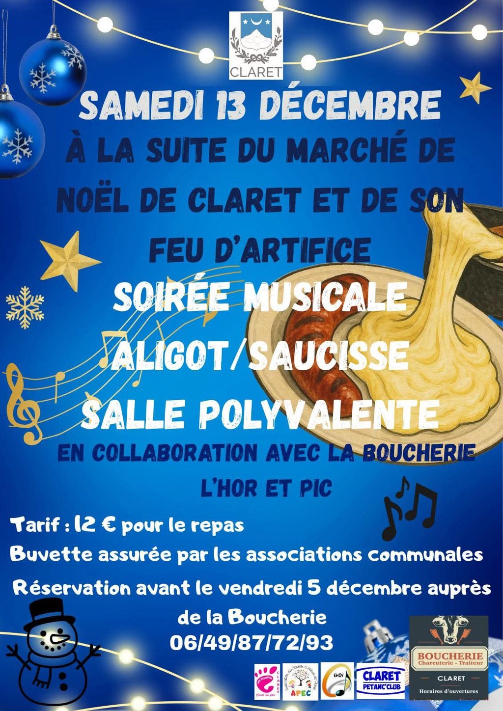 Réservation de l'aligot /saucisse auprès de la boucherie avant le 5 décembre : 12€