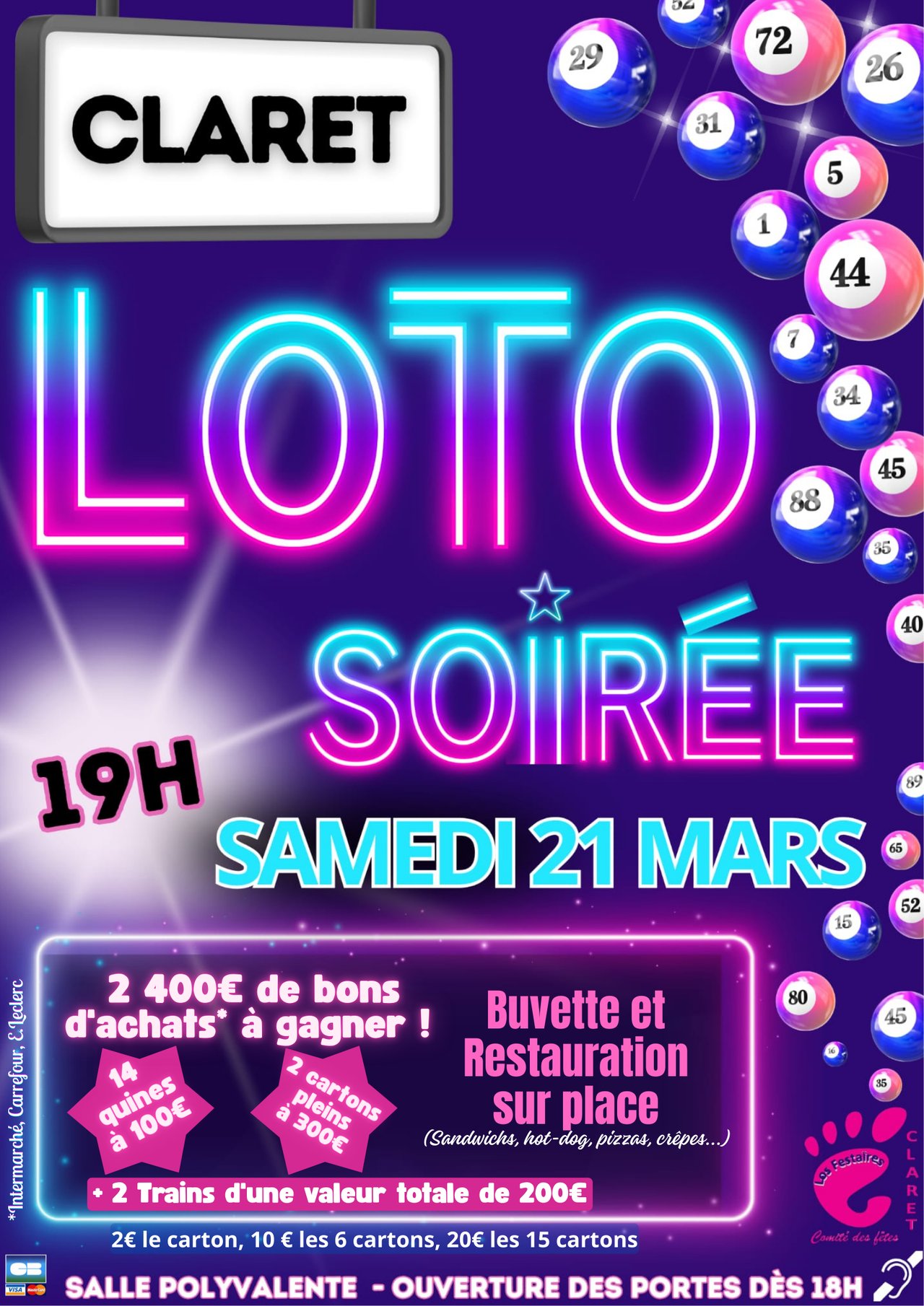 Le samedi 21 mars, le Comité des fêtes de Claret : Losfestaires. vous attend pour son loto nocturne ! Près de 2400 € de bons d'achat à gagner. Buvette et restauration sur place